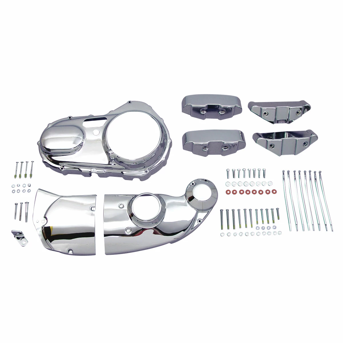 • Chrome metal dress up kit include chrome primary cover trim, cam cover trim, rocker box cover trim, master cylinder cover and chrome sprocket cover